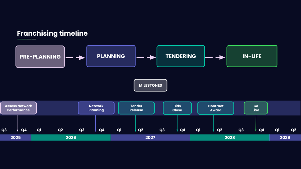 Every authority works to its own in-life launch date, so it’s important to map your franchising timeline by starting with that target and working backwards. This helps define the key stages and milestones along the way. The timeline below outlines an example network aiming to launch in late 2028, and highlights when pre-planning would need to start to stay on track.